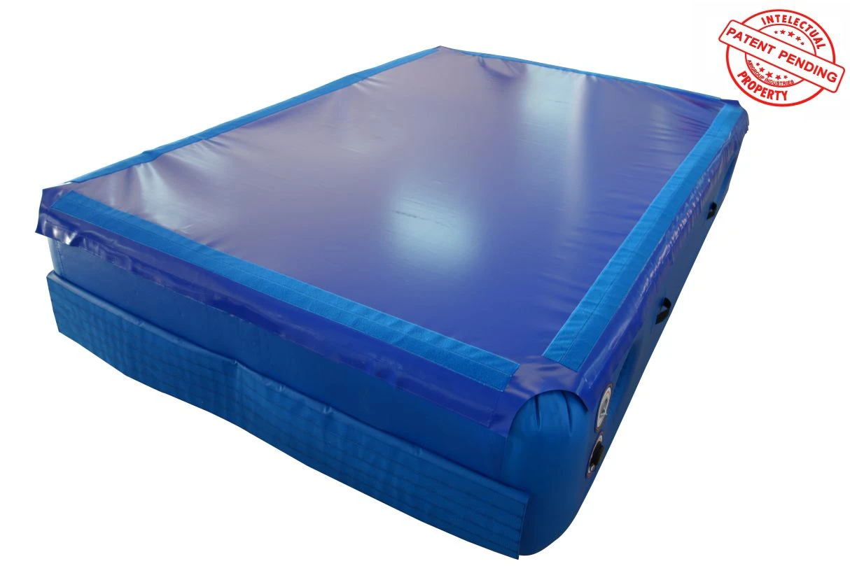 Durch Einstellen des Luftdrucks kann die Matte ideal auf den Nutzer eingestellt werden. Auch geöffnet als Landegrube mit Schaumstoffwürfeln einsetzbar. Ideal für Landungen und Abgänge nach Tumblingbahnen, Sprung, Stufenbarren, Reck oder auch Balken nutzbar.