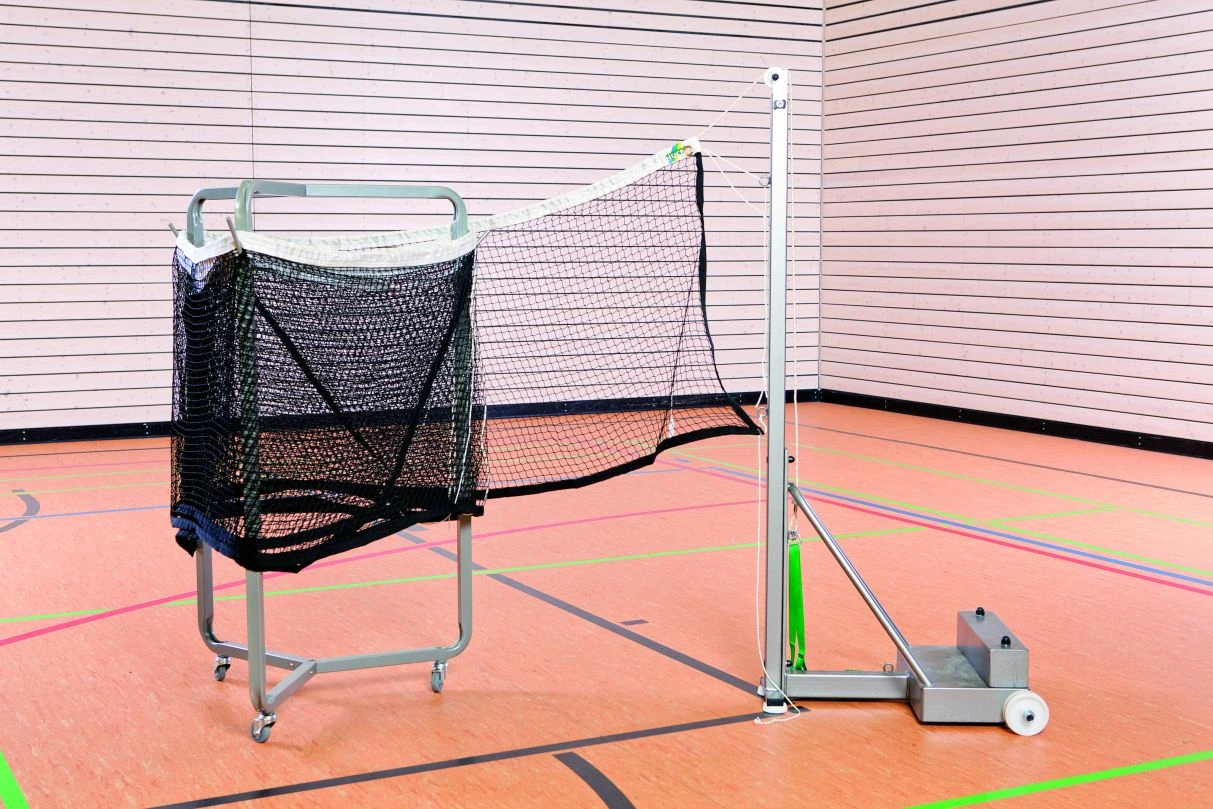 Mit diesem Aufbewahrungswagen für Netzgarnituren sind Badminton- oder Volleyballnetze ab sofort schnell und einfach auf- und abzuwickeln und ordentlich aufzubewahren. Dieser mobile Netzbügel bzw. Netzaufwickelwagen ist für alle Arten von Netzen geeignet, Tennis-, Badminton- oder Volleyball-Netze. Besonders geeignet ist der Wagen für Netzgarnituren. Geeignet für Garnituren mit bis zu 4 Netzen, z.B. für Volleyball-Langnetze. Der Wagen an sich ist zerlegbar und besteht aus pulverbeschichtetem Stahlrohr. Der Netz-Aufbewahrungswagen hat stabile und leichtgängige Fahrrollen und ist somit auf engsten Raum, z.B. im engen Geräteraum, sehr gut manövrierfähig.