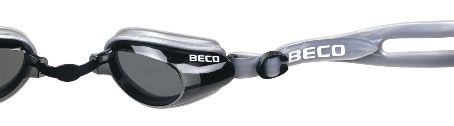Schwimmbrille mit geteiltem Kopfband und verstellbaren Nasensteg für einen optimalen Sitz.