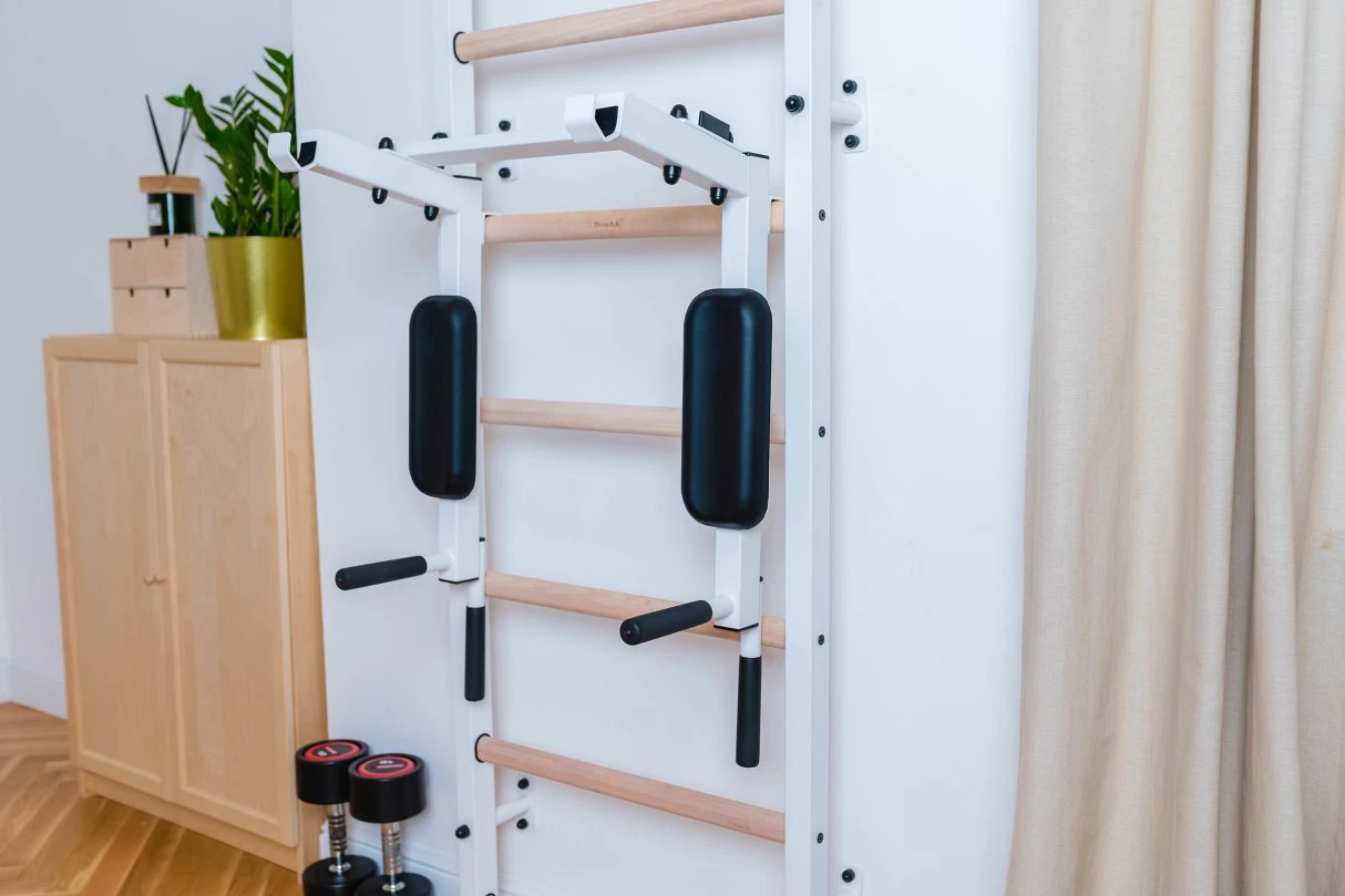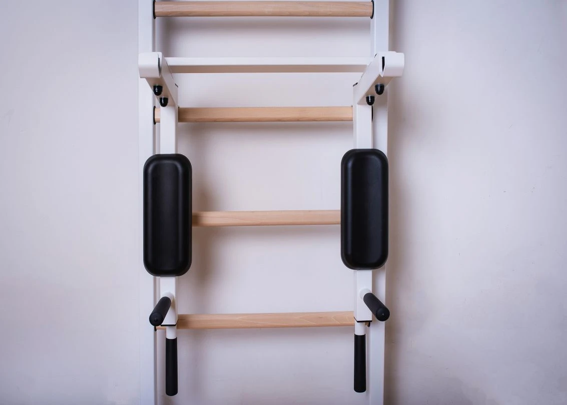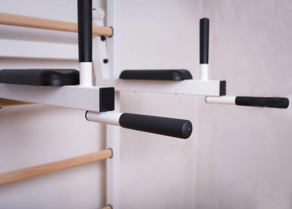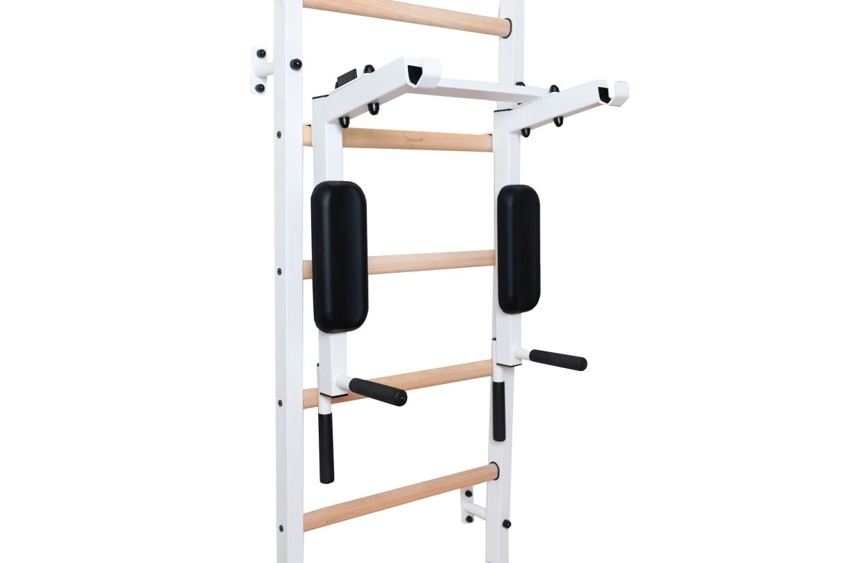 Dip-Bügel als optionales Zubehör für die BenchK® Sprossenwände der Serie 500. Er kann für das Training der Oberarme, des Rumpfes oder für ein Freihanteltraining verwendet werden, bei dem die Hantelstange in den Hantelaufnahmen der Konstruktion abgelegt werden kann.