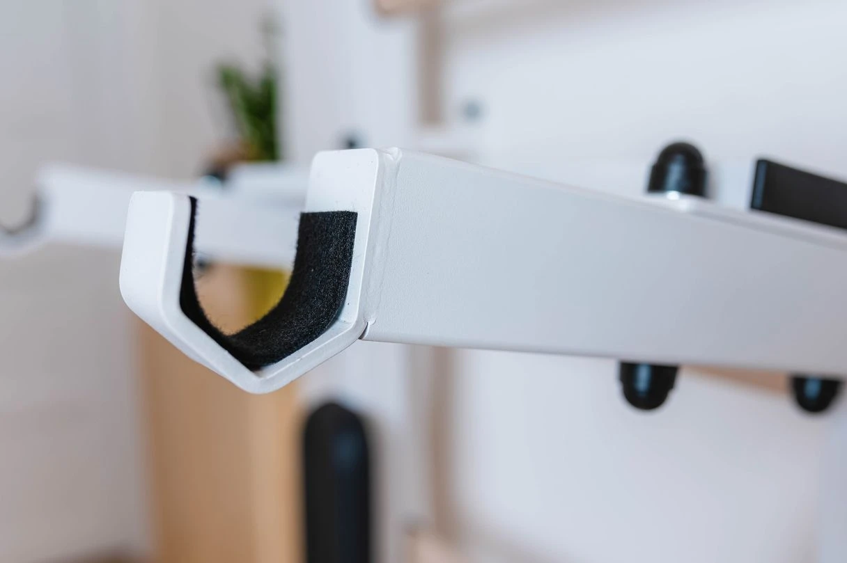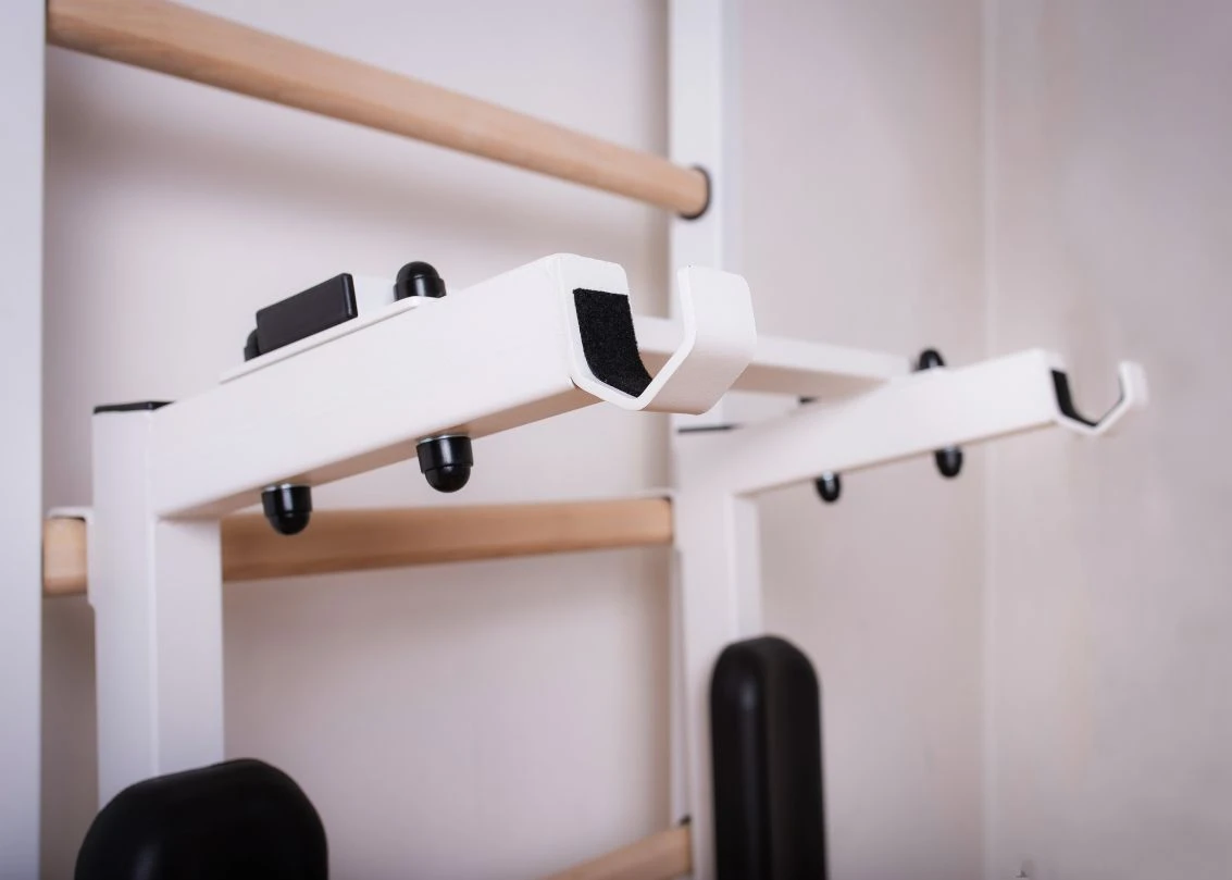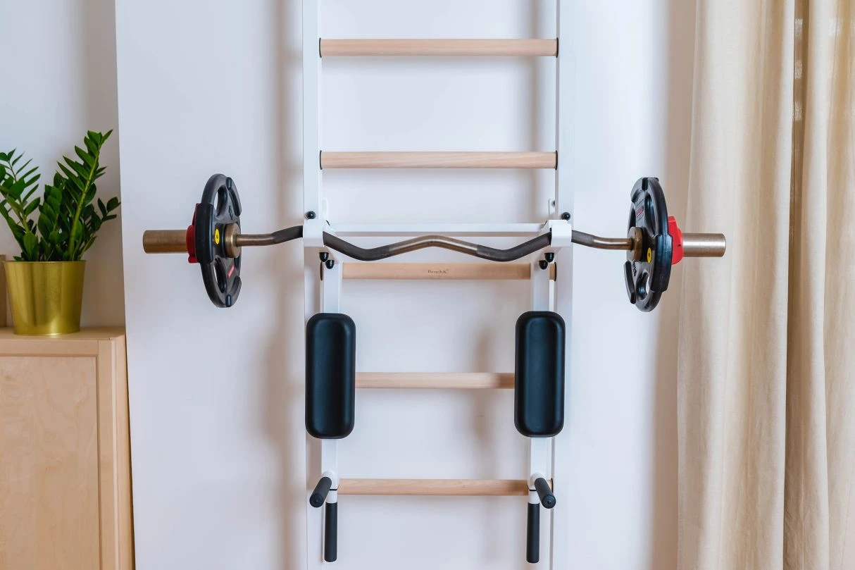 Dip-Bügel als optionales Zubehör für die BenchK® Sprossenwände der Serie 500. Er kann für das Training der Oberarme, des Rumpfes oder für ein Freihanteltraining verwendet werden, bei dem die Hantelstange in den Hantelaufnahmen der Konstruktion abgelegt werden kann.