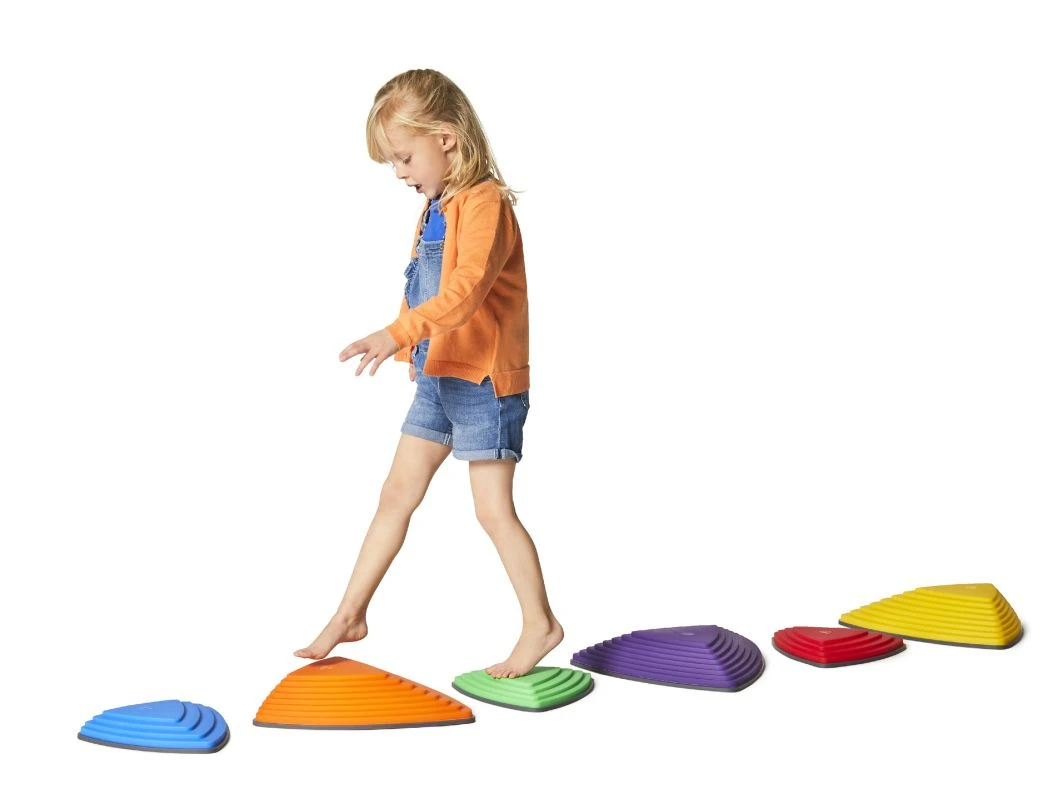 Gonge Fluss-Steine lassen sich auch ideal mit Gonge Hügelkuppen kombinieren. Es entstehen schnell anspruchsvolle Bewegungsparcours und spannende Balancierspiele.