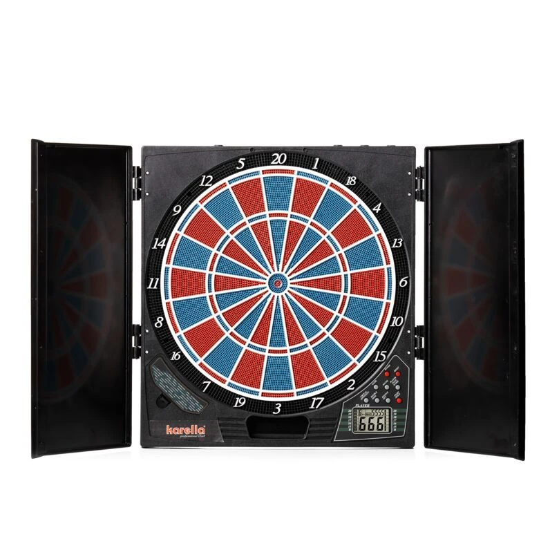 Der Karella® CB-25 Dartautomat ist eine 2-Loch Dartscheibe mit Turniermaßen. Die Segmente sind in Blau und Rot gehalten und die Spinne in weiß. Das Modell DB-25 hat zwei Schranktüren und Dartpfeilhalterungen im Rahmengehäuse. Der Dartautomat bietet 29 verschiedene Spiele mit 90 Spielvarianten an.