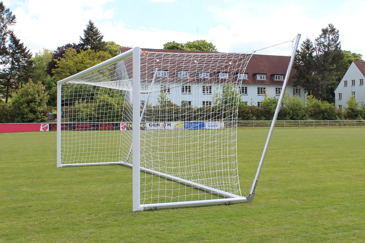 Innovatives Fußballtor für den multifunktionalen Einsatz, z.B. als Wettkampftor oder auch als Trainingstor zum mobilen Einsatz. Es werden keine Bodenhülsen benötigt und bietet dennoch das Gefühl eines Wettkampftores mit seiner Tortiefe von 2 m oben und unten. Optisch ist es vor allem deswegen ansprechend, da es den Anschein einer freien Netzaufhängung wie bei Stadiontoren erweckt. Es können zusätzliche Gewichte am Bodenrahmen angebracht werden, um für Kippsicherheit zu sorgen.