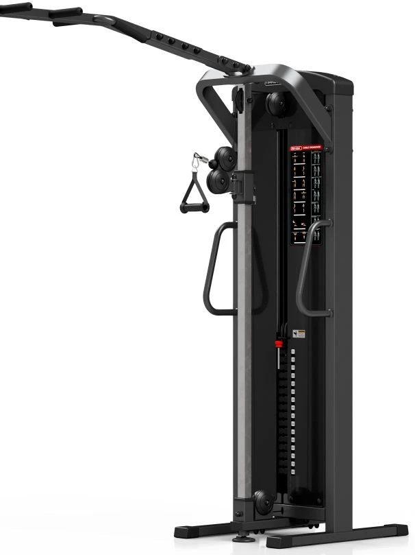 Professioneller Doppelkabelzug in Studioqualität. Neben den beiden Kabelzügen bietet das Gerät im Verbindungsstück auch Klimmzugmöglichkeiten in verschiedenen Griffpositionen. Alternativ können dort auch Sling-Trainer eingehängt werden. Die Griffe der Seilzüge sind schaumstoffüberzogen und die Höhe kann einfach und schnell über ein Stecksystem variiert werden.
