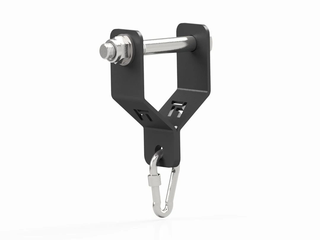 Der Karabinerhalter ist für den Einbau von Zubehör für das funktionelle Training bestimmt. Die Seite mit der Befestigungsschraube wird am Rig montiert und mit dem Karabiner wird das Zubehör befestigt.