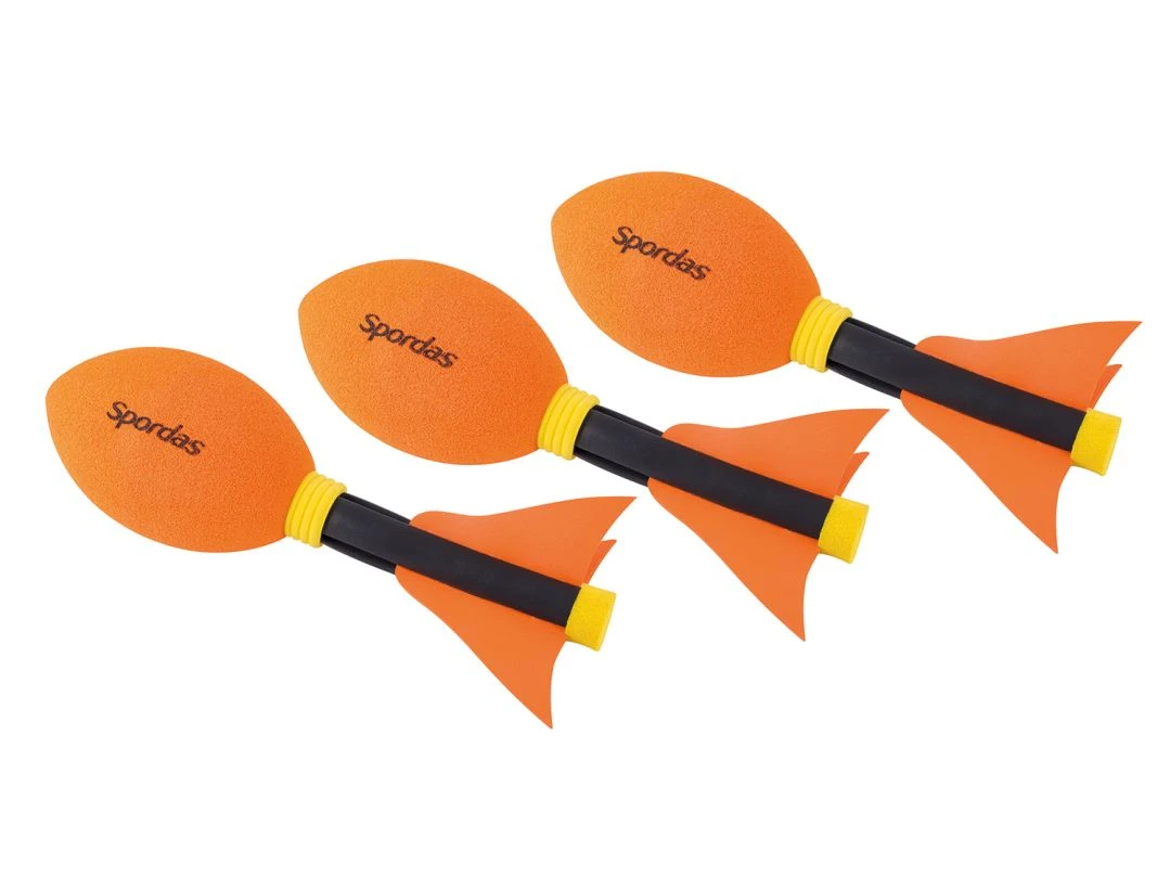 Es ist ein ideales Wurfgerät für Kinder. Das leuchtende orange und die Konstruktion sorgen für eine gut sichtbare Flugbahn. Das geschäumte Gummimaterial gewährleistet einen sicheren Umgang. Auch für den Einstieg ins Speerwurftraining geeignet. Ein Torpedo wiegt ca. 40 g und ist 22 cm lang.