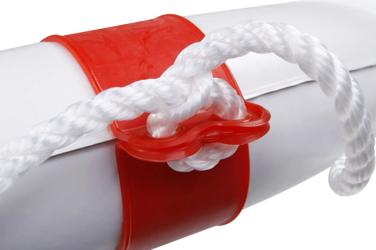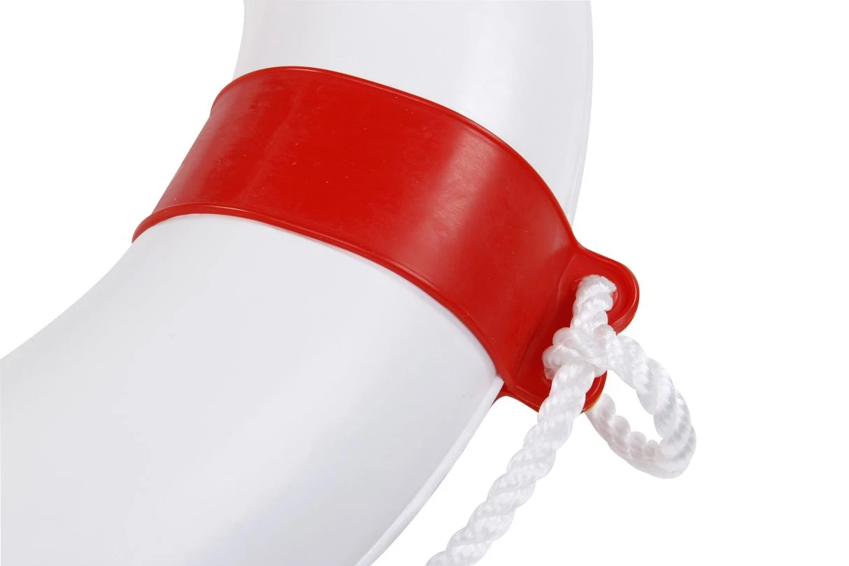 Der Rettungsring ist aus Styropor mit einem Kunststoffbezug ummantelt in Rot / Weiß mit umlaufender Griffleine aus Polypropylen. Der Rettungsring hat einen Durchmesser von 60 cm und eine Traglast bis zu 100 kg.