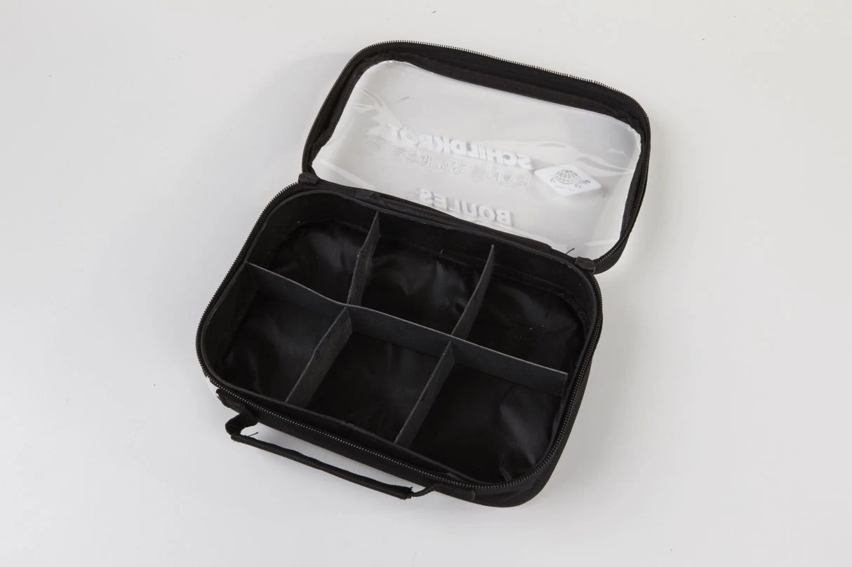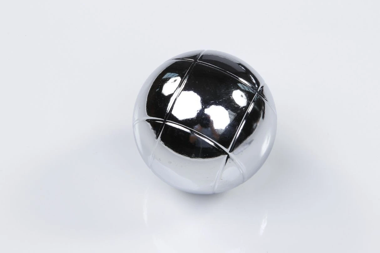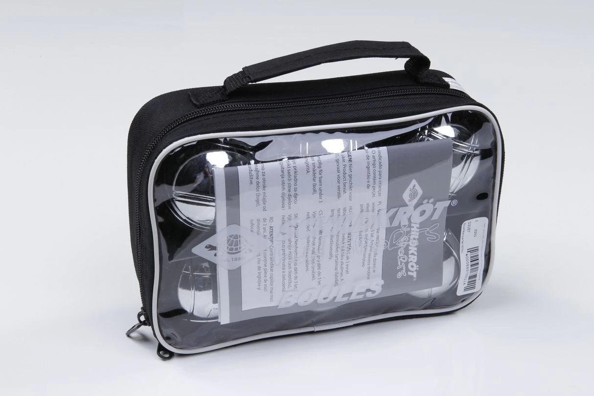 Boule Set aus 6 Kugeln für 2 Spieler. Die Boule oder Pétanque Kugeln aus Stahl sind mit zwei unterschiedlichen Markierungen versehen, damit die Kugeln nach den Würfen auch auseinandergehalten werden können. Das Boule Set besteht aus 3 x 2 Kugeln aus Metall mit einem Ø 7,25 cm, 1 Zielkugel aus Holz, einem Abstandsmesser und einer schwarzen Nylontasche mit Tragegriff.