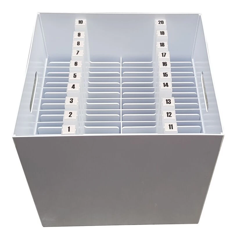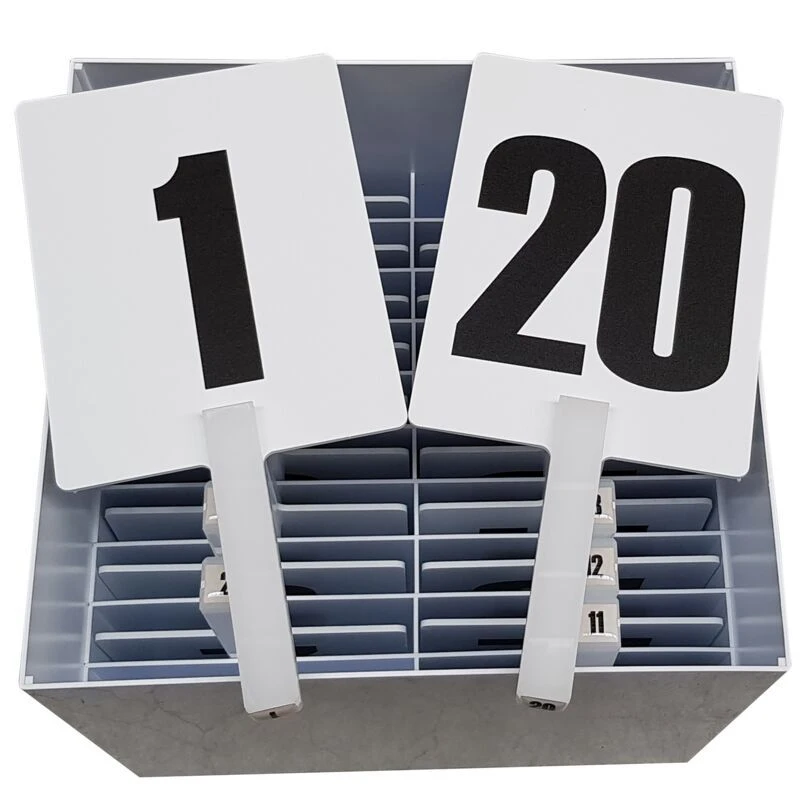 Spielerwechsel Tafeln nach den Volleyball FIVB Regeln, beidseitig nummerierte Tafeln für zwei Teams, Nummerierung 1-20, in 2 Kunststoffkästen für sichere Aufbewahrung der Sätze. Jede Tafel im separaten Fach für schnelles und bequemes Handling.