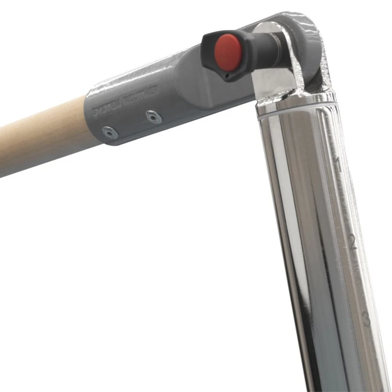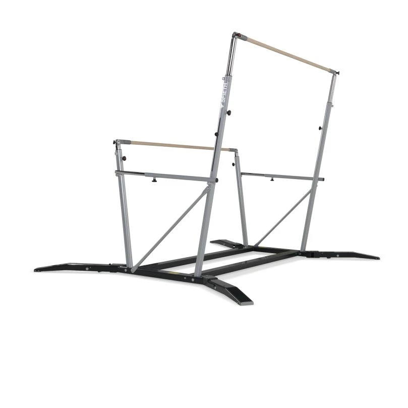 Der Stufenbarren “Club” kann auch als 1-Holm-Modul eingesetzt und mit einer Reckstange genutzt werden. Zwei Schnellspannvorrichtungen ermöglichen einen leichten Austausch der Holme. Die ausklappbaren Standfüße verleihen dem Stufenbarren eine hohe Stabilität.