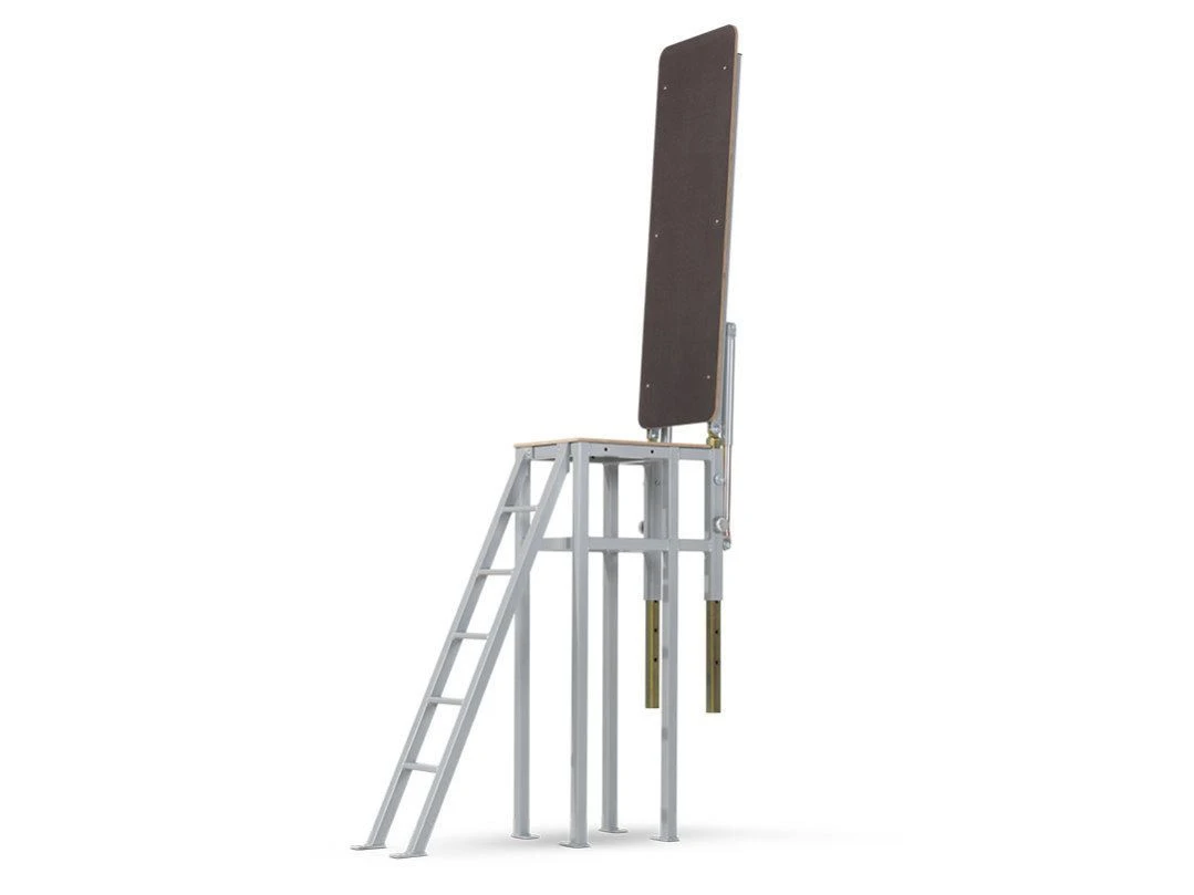 Das Trainerpodest ist höhenverstellbar, freistehend und klappt zurück, sobald der Benutzer die Plattform verlässt. Die Trainerplattform ist sowohl für den Gebrauch an Ringen als auch für Landegruben geeignet.