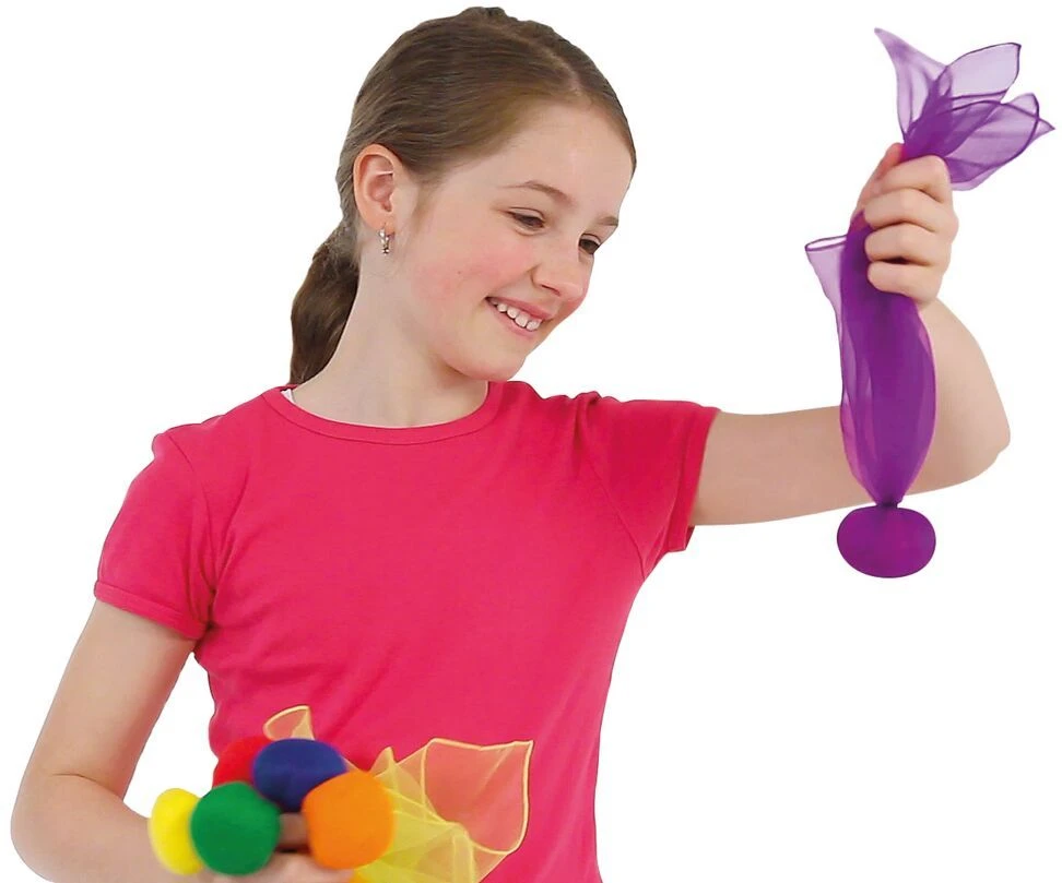 Mit den Wurfsäckchen sind spannende Team- und Gruppenspiele im Sport- oder Freizeitunterricht möglich. Durch das angehängte Chiffon Tuch verlangsamt sich die Flugphase und ist leichter zu fange. Ideal also für viele Fang- und Wurfspiele.