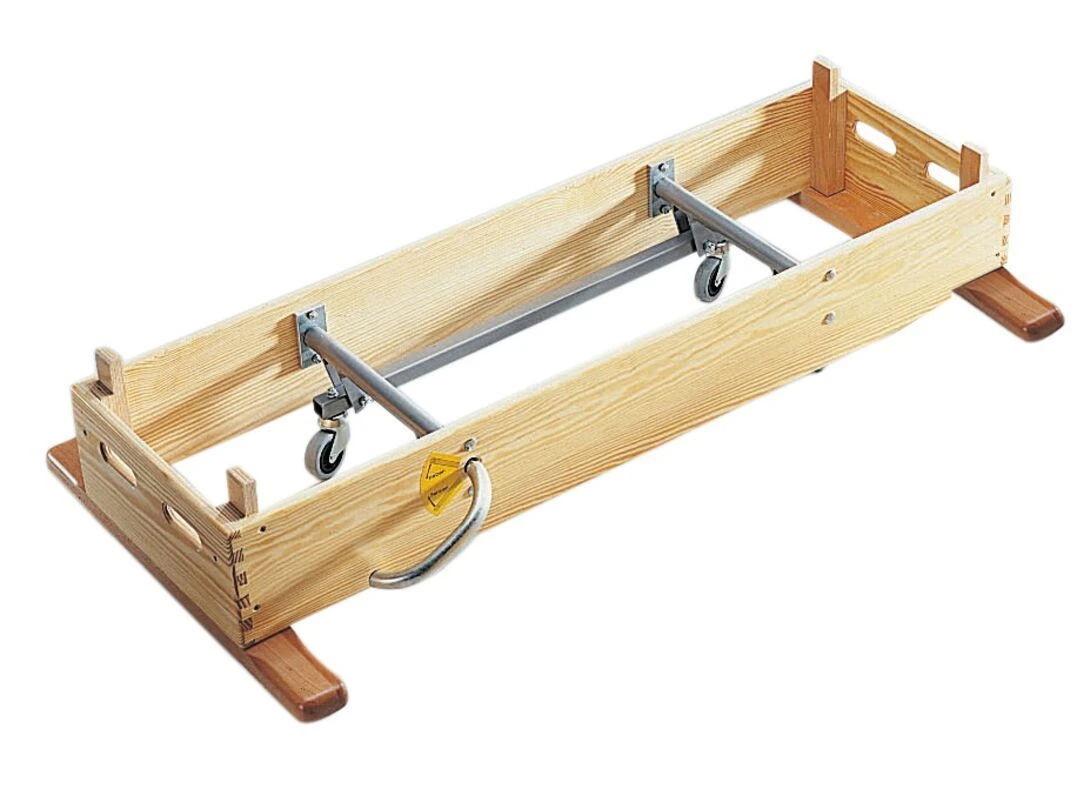 Nachrüstsatz für Sprungkästen. Der Turnkasten kann dank der Fahreinrichtung mit den 4 Schwenkrollen einfach transportiert werden. Vor Gebrauch erfolgt die Absetzung auf die Standfüße.