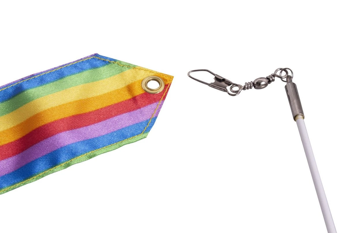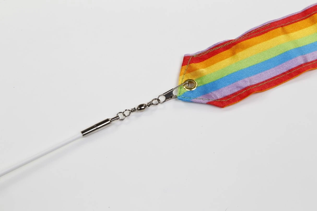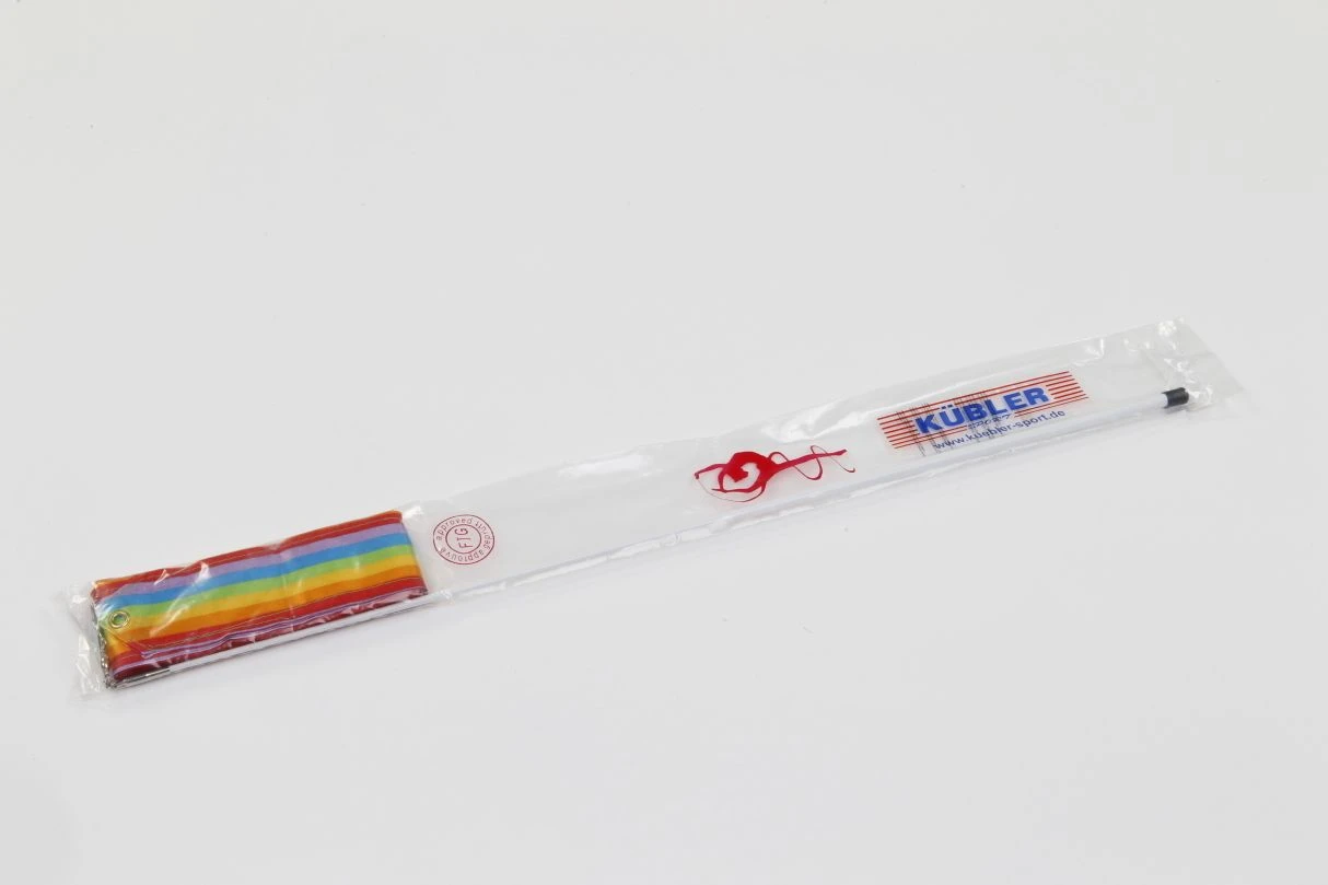 Gymnastikband im Regenbogen-Design für die Rhythmischen Sportgymnastik. Band aus Satin, 6 m lang und 5 cm breit, inklusive Glasfaserstab und Drehwirbel.