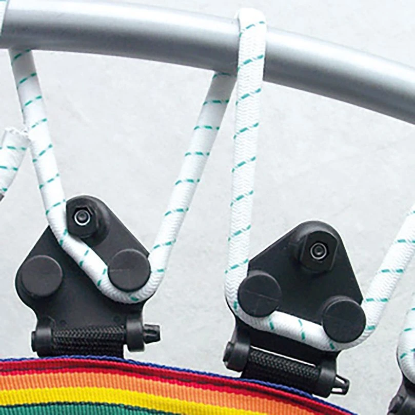 Die Gummiseile sind in 5 verschiedenen Farben erhältlich und durch ihre spezielle Ummantelung besonders langlebig. Die Sprungmatte hat durch die fünffache Vernähung am Sprungmattenrand ebenfalls eine hohe Lebensdauer.