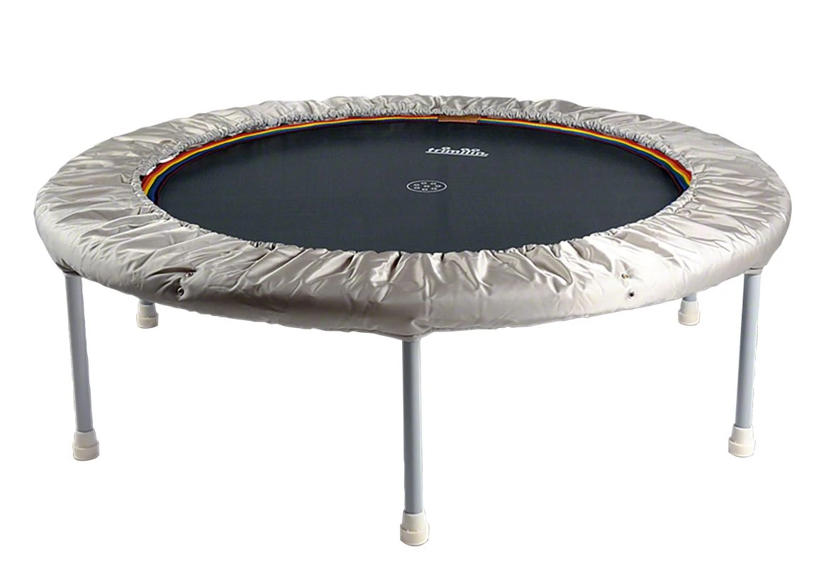 Das Modell mit der neuartigen Vario-Technik, bei dem man sich mithilfe der 12 Vario-Gummiseile die Spannung des Trampolins ganz leicht selber einstellen kann. Damit lässt sich die Grundeinstellung der Federung sowohl straffer, als auch weicher einstellen. Es können dabei alle oder einzelne Gummiseile modifiziert werden, womit die Weichheit der Matte sehr fein dosiert werden kann. Mit seinen erhöhten Beinen (Oberkante Rahmen ca. 35 cm) ist das Modell Trimilin® Vario 120-35 PLUS bestens geeignet für leichtes, sanft dosiertes Schwingen. Außerdem besitzt das Trampolin eine sehr flexible, nachgiebige Sprungmatte und hat dadurch eine hohe Trainingsintensität für Stützmuskulatur und Sprunggelenke und ist dabei schonend für Rücken, Gelenke und Bandscheiben. Die Gummiseile sind durch ihre spezielle Ummantelung besonders langlebig. Die Sprungmatte hat durch die fünffache Vernähung am Sprungmattenrand ebenfalls eine hohe Lebensdauer.